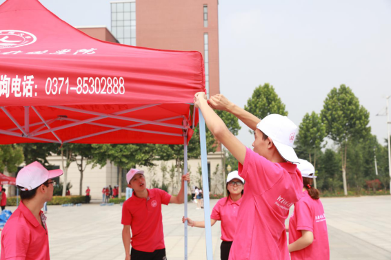 大会前期,新联学院志愿者与参会高校工作人员联系,为其提供所有对接服务工作,包括天气、酒店、交通等相关信息;场地内帐篷、桌椅等物资的运送及摆放及喷绘的搭建;粘贴、标明会场服务处和周边楼区标示等。大会期间,志愿者负责对接单位宣传点宣传资料及相关物品的领取接收,帮助对接单位悬挂条幅、摆放物品、分发资料,协助招生工作人员为考生家长答疑解惑;后勤组的志愿者分别在学校的南门和西门,配合交警队负责车辆的引导、指挥和疏通工作,并不间断地在学校的各个场地监督检查,禁止与咨询活动无关人员进入现场,协助保卫科及时处理场内出现的突发事件,维持校园的安全稳定;会场清理组的志愿者负责全天不间断打扫会场内卫生,使会场时刻保持干净、整洁。