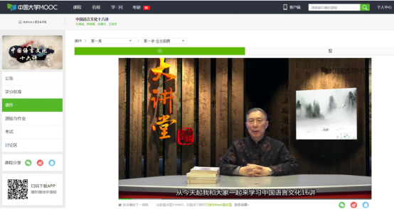 中国大学MOOC是由网易与高教社携手推出的在线教育平台,承接教育部国家精品开放课程任务,向大众提供中国知名高校的MOOC课程。《中国语言文化十六讲》在中国大学MOOC上线,实现了我校省级精品在线开放课程零的突破,是我校精品在线课程建设的首创成果。