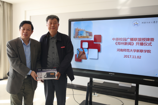 仪式上,郑州人民广播电台副台长、校园联盟副理事长刘平为我校授牌,副校长陈江风接受牌匾并回赠礼品。郑州电台台长助理、校园联盟秘书长方敬毅为我校赠送设备。