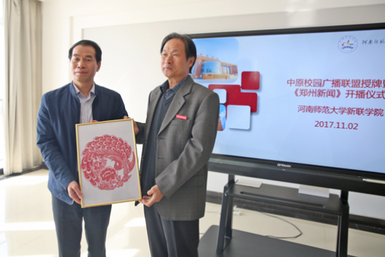 副校长陈江风(右)向郑州人民广播电台赠送礼品