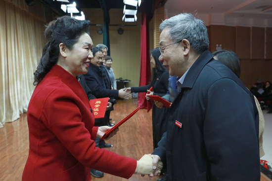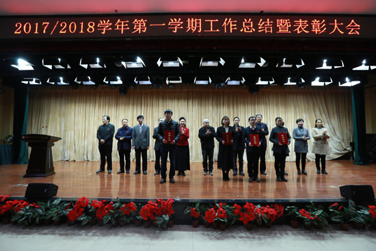 副校长陈江风宣读了“2017-2018学年第一学期考核优秀及突出贡献奖”获奖名单,文学与传媒学院、外国语学院、教育学院、机电工程学院团队和公共教学部朱媛老师荣获“突出贡献奖”,机电工程学院马鹏辉等91人被评为“考核优秀人员”,校领导分别为获奖团队代表和个人颁奖并合影留念。考核优秀教师代表、文学与传媒学院教师冯娟娟发言,她对学校领导和同事的关心与帮助表示衷心感谢,表达了全体教职工竭尽全力实现学校发展愿意的共同心声。
