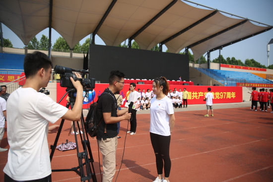 活动现场,河南师范大学新联学院1014名学生身穿黄色T恤,怀着满腔热爱,首先拼出了由镰刀锤头组成的中国共产党党徽,然后艺术学院师生用大合唱《不忘初心》,向我们伟大的党献上由衷的祝福;接着河南新闻广播四名主持人与新联学院的同学们一起,带来了诗朗诵《七月赞歌》,激情澎湃的朗诵,为党的生日献上由衷的赞歌。最后,河南师范大学新联学院1014名学生变换队形,拼出了鲜艳的中国共产党党旗形状。河南广播电视台、河南广电传媒控股集团二百多位党员领导干部,携手新联学院新党员,在党旗前重温入党誓词。每一句入党誓词,激励着党员不忘初心,以党章规范、激励自己的言行,牢记党的宗旨,立足岗位奉献,履行党员义务,切实发挥模范带头作用。活动结束后,段其旺副书记及部分学生新党员接受了河南电视台等多家媒体的采访。