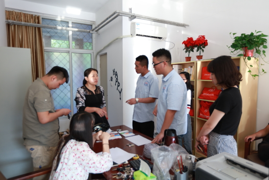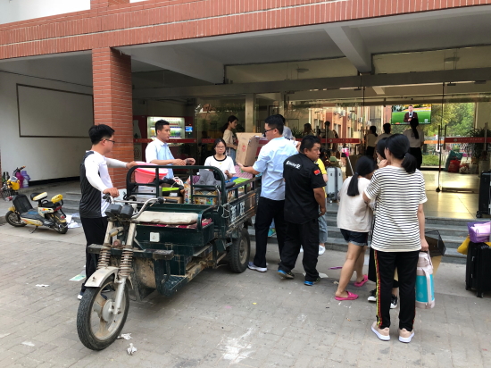 作为宿舍管理员,是学生进宿舍的第一道岗,也是宿舍熄灯锁门的最后一班岗,在寝室搬迁中,他们的作用也发挥得淋漓尽致。管理员娄小玲说:“这么多人,这么多东西。能帮啥就帮啥,帮学生看个东西,修个东西啥的”。同样是管理员的张双玲有了更多的责任:“咦,人多的很呐,有时候几个门都得打开,你得注意安全,防止有学校外陌生的人混进来。你还得帮学生照看个东西,统计维修事项,闲不住。” 公寓服务中心胡颂丹、周超飞等人在学生毕业离校、寝室搬迁等各项重大工作中保持6月无休,搬寝室期间最晚的能干到深夜2点的忙碌状态,还会时不时的来一顿“深夜食堂”。维修师傅赵宇疲惫似的倚靠在大厅里面一根柱子旁边,对笔者摊摊双手:“今天总算搬完了。”现场,笔者还时不时遇到胡杰、柴秀青等老师忙碌的身影,他们一边帮学生从车上卸东西,一边关心地问着每一个旁边搬东西经过的学生:“搬的如何了,别落掉东西,注意安全啊。你们屋的水电没问题吧?”还不时的跟学生开两句玩笑,引起学生们爽朗的笑声一片。