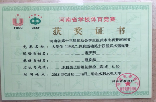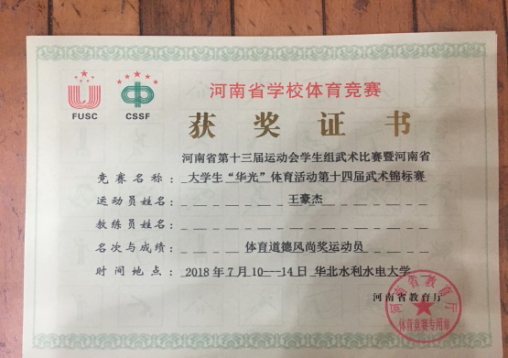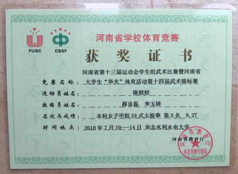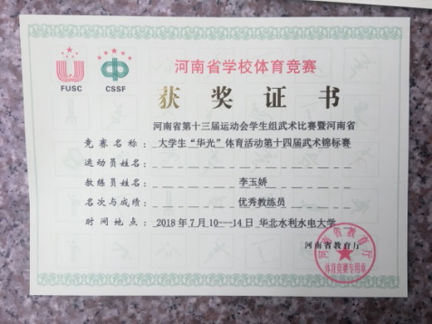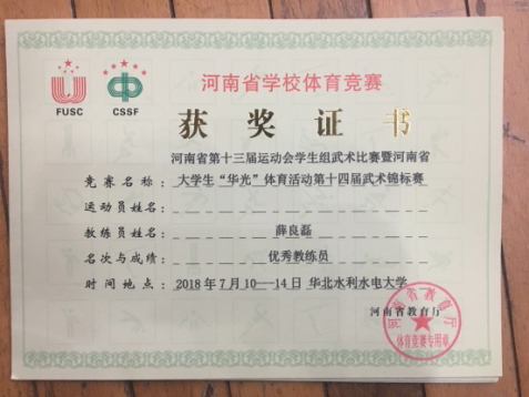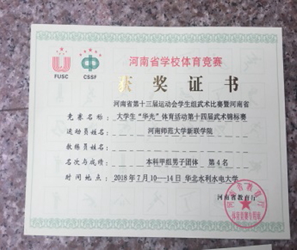 7月10日至17日,由河南省教育厅、河南省体育局主办的2018年河南省第十三届运动会学生组武术比赛暨河南省大学生“华光”体育活动第十四届武术(套路)锦标赛在华北水利水电大学举办。本届大赛共有来自河南省49所高校的719名运动员参赛,我院派出1支代表队参加了甲组别的比赛。