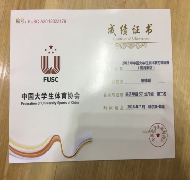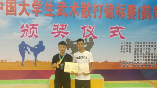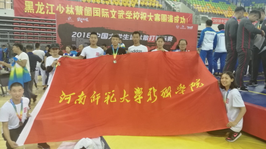 7月21日,2018年中国大学生武术散打锦标赛(北区)在黑龙江鹤岗市体育馆落下帷幕。在副校长陈江风、教务处处长冯蔚、公共教学部主任陈菁、领队张辉,教练薛良磊的带领下,首次参加了大学生甲组的比赛。经过6天的激烈奋战,最终我校商学院2017级行政管理的宋李明获得男子甲组57kg级亚军,这也是我校在大学生武术比赛中历史最好成绩!