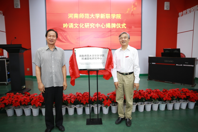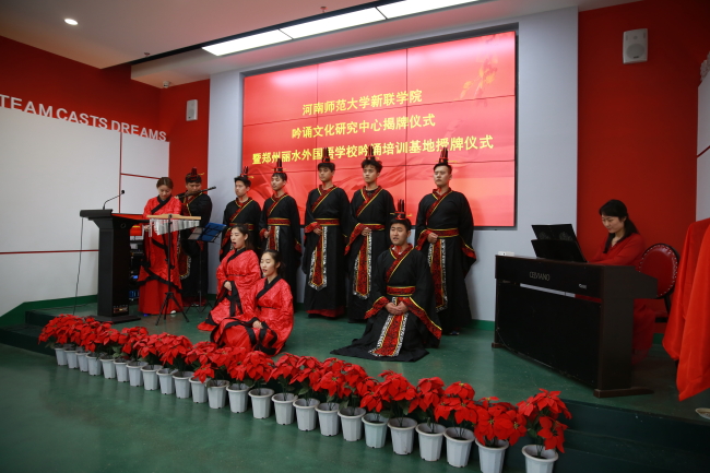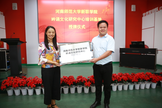 揭牌仪式由文学与传媒学院院长、吟诵文化研究中心主任左丽娟主持,郑州丽水外国语学校政教处副主任袁征及该校教师代表,文学与传媒学院、艺术学院部分教师共同参与。