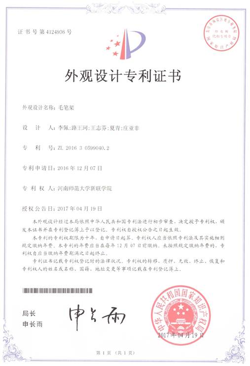 5月16日,我校机电工程学院李佩老师接到中华人民共和国国家知识产权局授权的“毛笔架”外观设计专利证书(专利号:ZL 201630599040.2),这是我校第二次荣获国家知识产权局授权的专利,也是我校首次荣获国家外观设计专利。